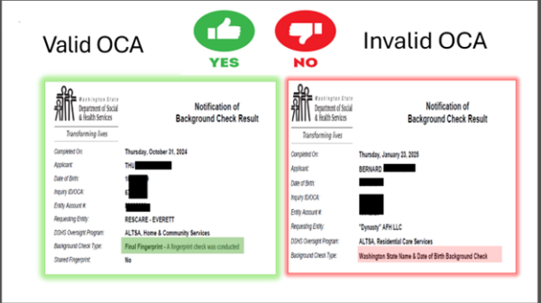 Over the past two years, WHCA has engaged in stakeholder work to gain better understanding of the significant home care aide (HCA) backlogs to credentialing. While there are many moving parts to this catastrophe, two main issues arise when it comes to moving a pending HCA candidate to active status. One is proof of employment, and the other is a valid OCA number for background check finalization.